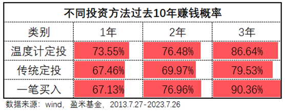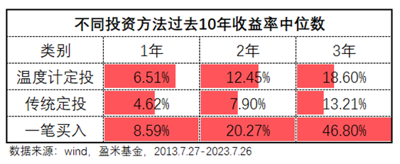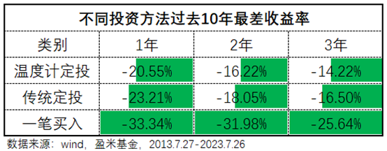 2、 过去10年,任意1天买入,或开始定投,1/2/3年平均收益率。整体来看,一笔买入收益率更高,其次是温度计定投,最后是固定时间固定金额定投。