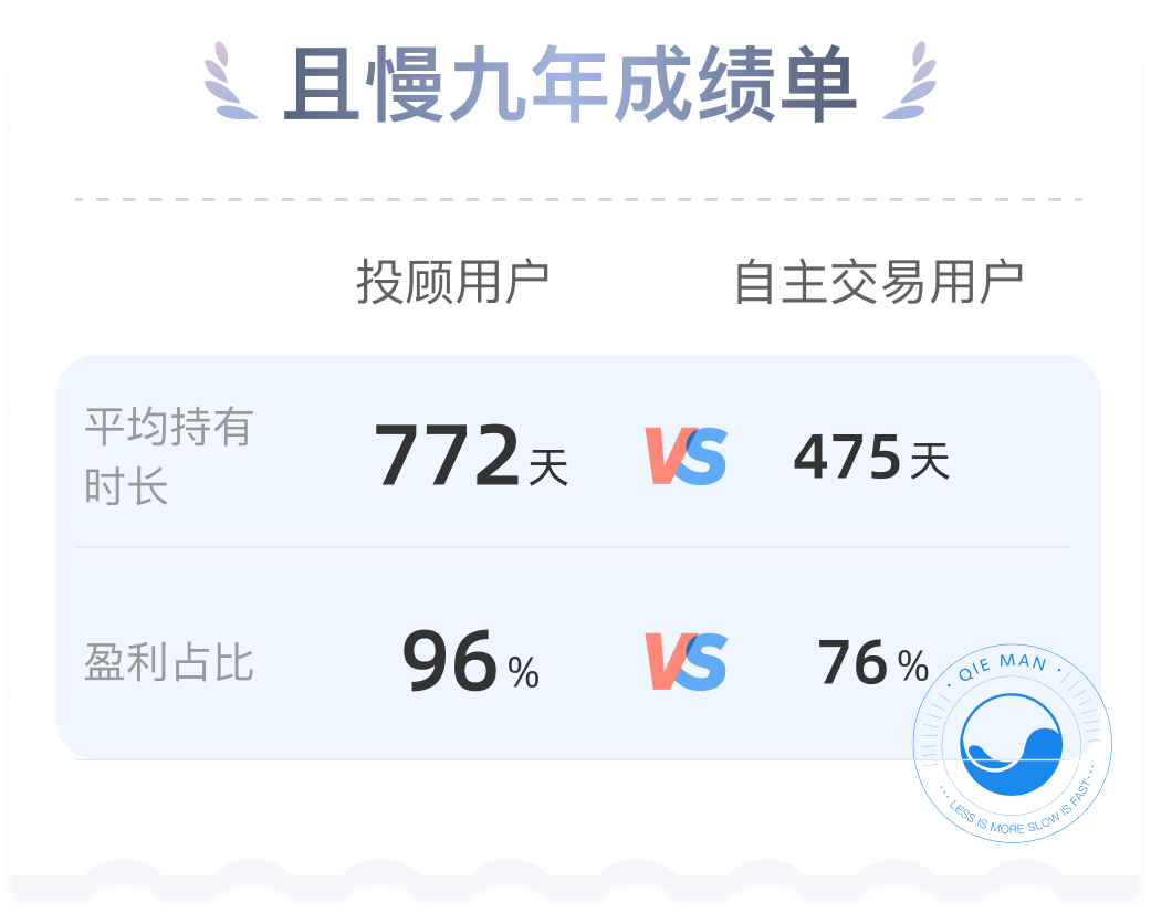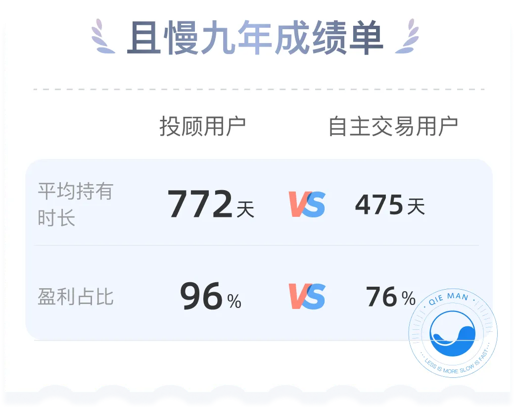 这一切最终变成靓丽的投顾用户数据:且慢投顾用户平均持有时长为772天,盈利占比为96%,均高于自主交易用户。(注1)