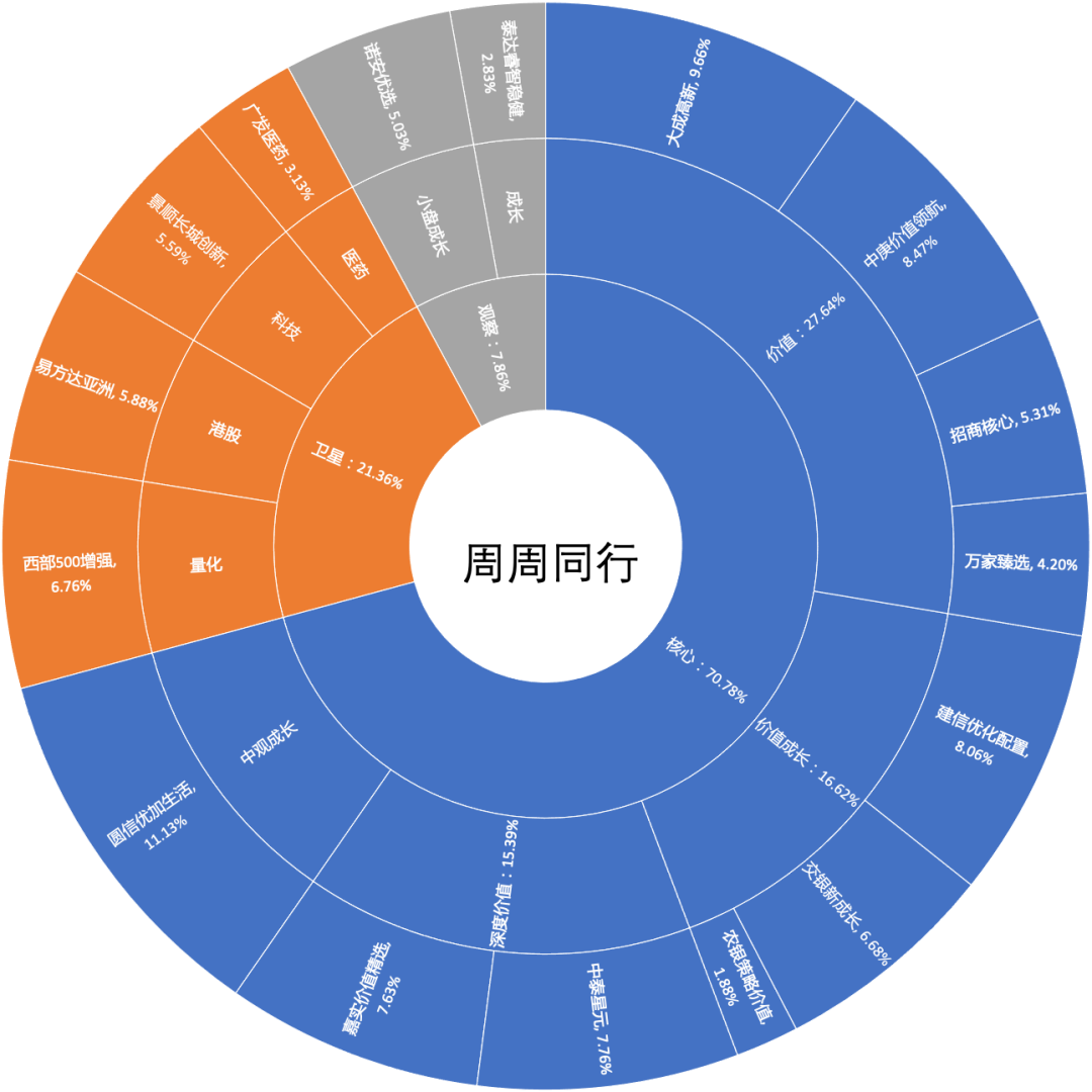 周周同行采取“核心+卫星”模式,核心仓主配全市场选股、注重估值性价比、业绩曲线稳健的基金经理;