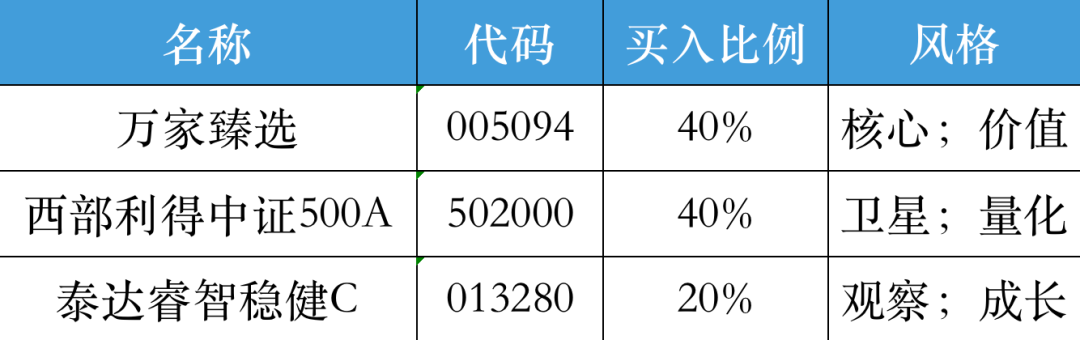 本次发车买入价值风格的万家臻选、量化偏成长风格的西部利得500增强,以及成长风格的泰达睿智稳健,整体搭配为一个均衡性的发车组合。