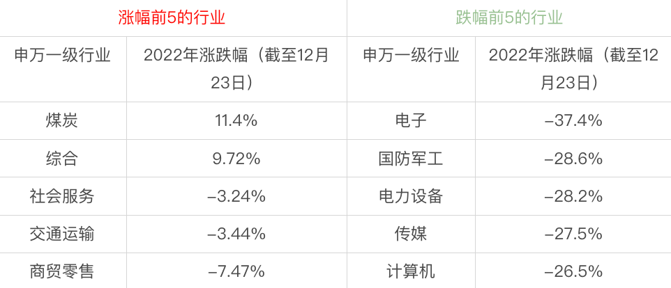 行业表现上,以申万一级行业来看,涨幅为正的只有煤炭、综合两个行业,2021年表现好的军工、新能源等成长风格的行业,则位列今年跌幅榜前列。