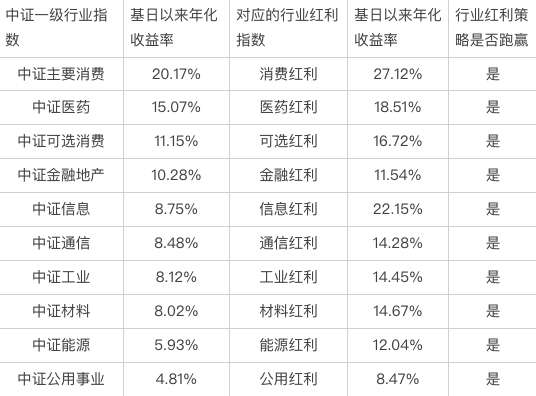 我统计了中证10个一级行业指数和行业红利指数的历史收益率(行业指数的基日为2004年12月31日,行业红利指数的基日为2005年12月30日,基日稍有差别,但不影响结论):