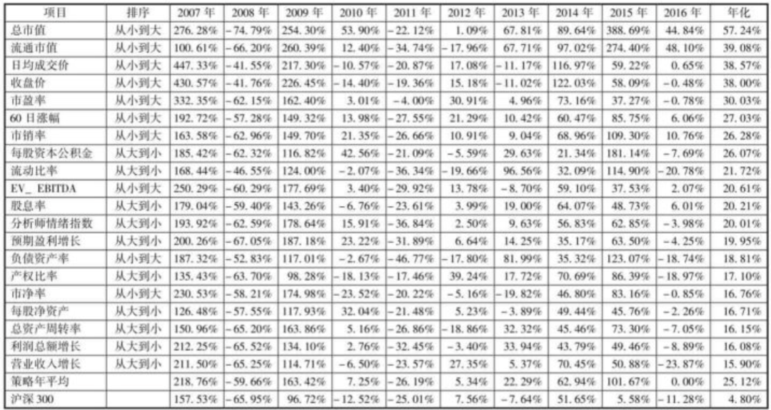 我初看这个表,还是比较吃惊的,A股历史上收益最高的策略居然是小市值策略(对应上表第一、二行的总市值因子、流通市值因子)和低价股策略(对应上表第三、四行的日均成交价因子、收盘价因子):