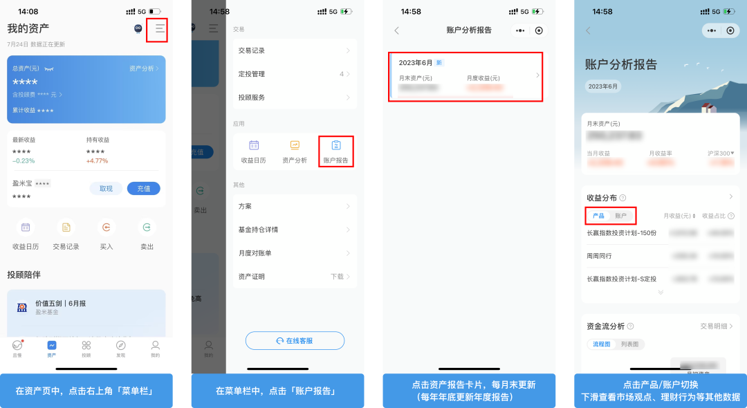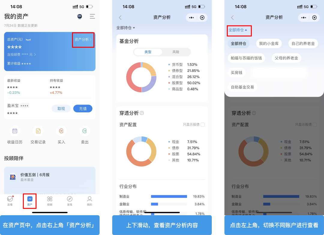 在【账户报告页】选择总资产或不同的投资账户,可以详细了解四大内容: