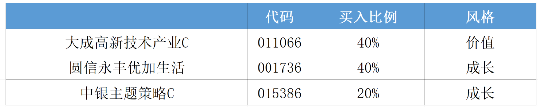 本次发车买入40%大成高新技术产业C(价值风格)、40%圆信永丰优加生活(成长风格),同时配置20%中银主题策略C(成长风格),整体搭配为一个均衡性的发车组合。