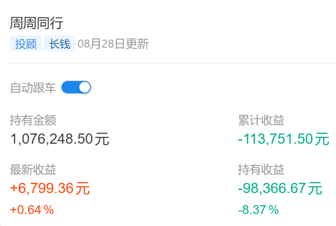 《周周同行》自2021年首次发车以来,累计发车119次,因此在这个位置倍投并不会改变整个组合的风险收益特征,反而进一步减少了组合的安全边际,所以在没有明确的足以扭转市场情况的信号出现之前,我是不会贸然启用“倍投”的 。