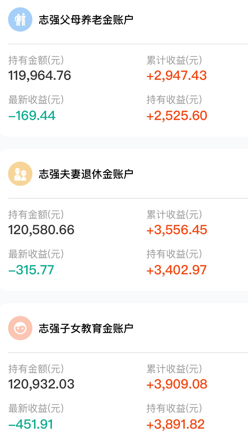 志强子女教育金账户累计跟投金额116999元,累计收益+3909.08元,累计收益率+3.34%;