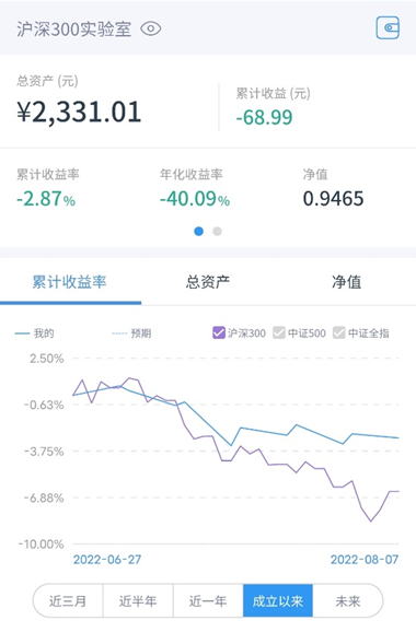 个人实盘来看,【沪深300实验室】上周一(8.1)定投 500元,累计收益率-2.87%。