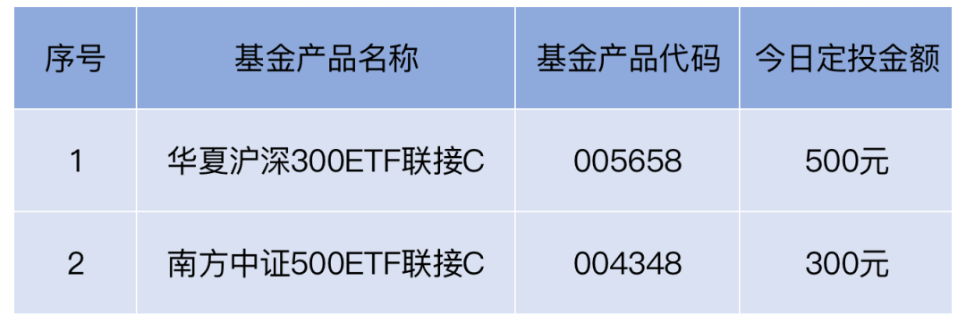 今天(2022.8.1),我会拿出500元,继续定投华夏沪深300ETF联接C,代码:005658.OF。拿出300元,继续定投南方中证500ETF联接C,代码:004348.OF。
