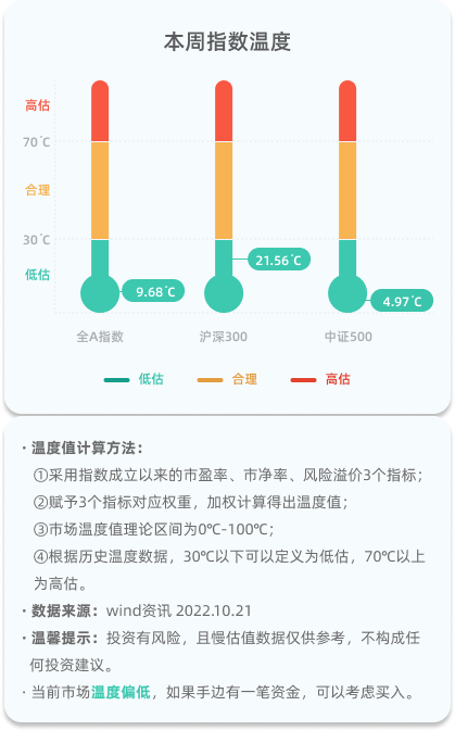全A指数当前9.68℃,沪深300当前21.56℃,中证500当前4.97℃。整体都处于低估区间。
