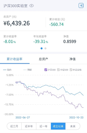 个人实盘来看,【沪深300实验室】上周一(10.17)定投 500元,累计收益率-8.01%。