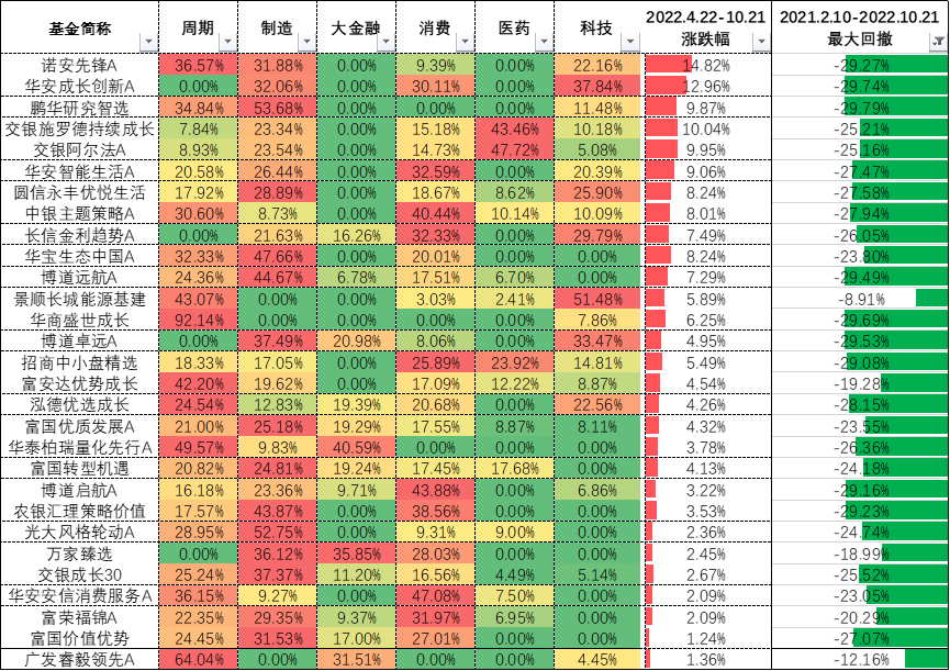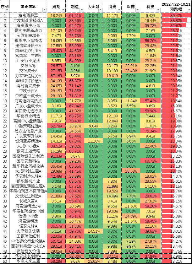 我们知道,最近6个月,6大赛道中就属制造赛道表现最靠前。2022.4.22-10.21制造赛道上涨10.96%。也就是说,最近6个月,谁重仓了制造赛道,谁的表现就更好。当然,周期赛道中的个别行业如煤炭、公用事业涨幅也不错,2022.4.22-10.21分别涨了5.74%、8.26%。还有科技赛道中的通信行业同期也涨了11.56%。所以,其他个别重仓了周期、科技赛道的基金也获得了正收益。