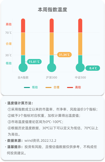 当前沪深300指数温度处于【30℃-40℃】区间,中证500指数温度处于【10℃以下】。(数据来源:wind资讯,且慢市场温度计,2022.12.2)