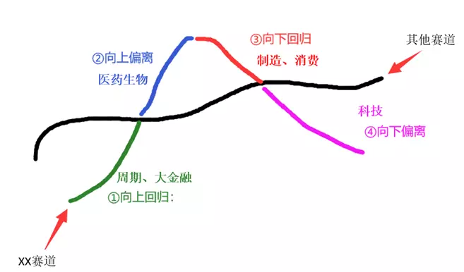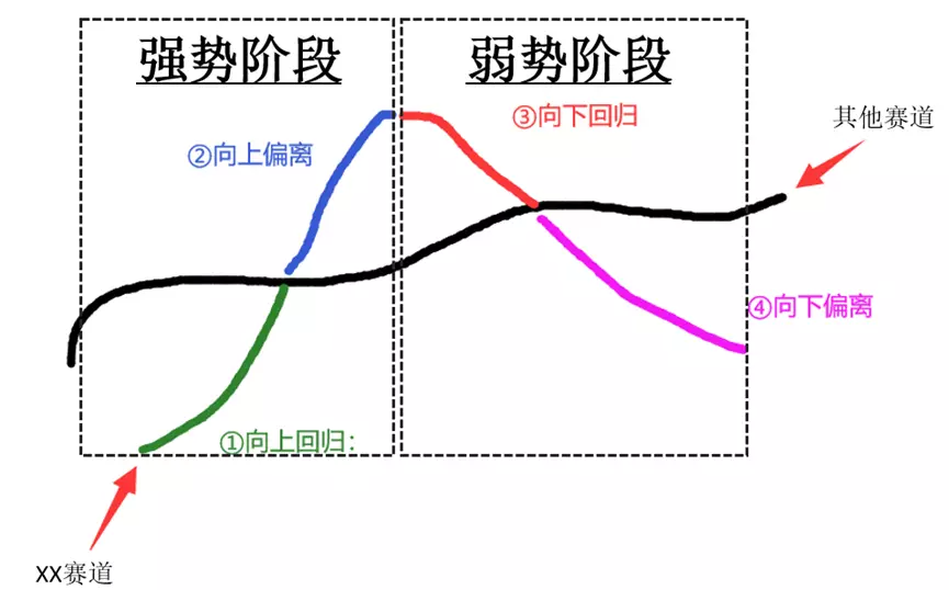 当某一赛道相较于其他赛道处于向上回归或向上偏离的时候,往往意味着该赛道处于更强势阶段。当处于向下回归或向下偏离的时候,往往意味着该赛道处于相对弱势阶段。如下图所示: