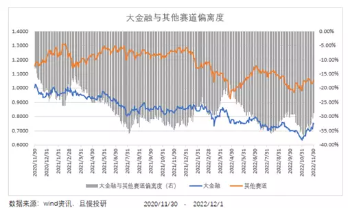 3、 大金融赛道处于弱势反弹阶段。2020年以来大金融赛道相比较其他赛道而言,一直处于向下偏离态势,处于弱势阶段。但2022年11月份以来,偏离度达到了过去几年的极值,随后开始反弹,当前处于向上回归的反弹阶段。