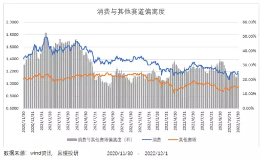 4、 消费处于弱势阶段,但趋势有所反转。2021年2月以来,消费赛道相较于其他赛道,一直处于向下回归的态势。处于弱势阶段。但2022年10月底以来,向下回归的态势有所止住,当前趋势有所反转。