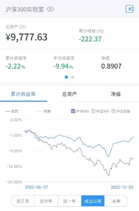 个人实盘来看,【沪深300实验室】上周一(11.28)定投 500元,累计收益率-2.22%。