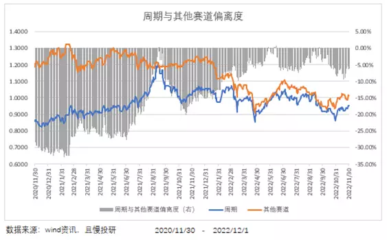 1、 周期处于相对强势阶段,但趋势有所走弱。我们可以看到周期,相较于其他赛道而言,一直处于向上回归的态势,处于强势阶段。但2022年4月以来,始终没能继续向上突破,意味着当前趋势有所走弱。