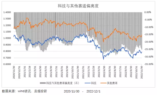 6、 科技赛道处于强势阶段,但趋势同样有所走弱。2022年9月底以来科技赛道相较于其他赛道,处于向上回归的态势,处于强势阶段。但11月底以来,趋势有所走弱。