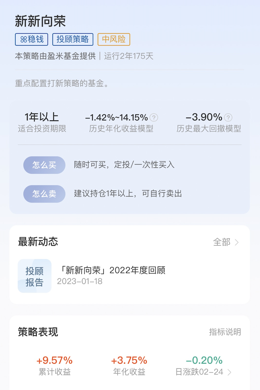 本周我还是会维持降低权益资产增速的打法,拿出500元现金流,定投固收加策略的【新新向荣】。