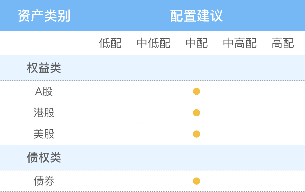 当前我们建议中配(略超配)股票(A股)、中配债券。主要大类资产配置建议如下:
