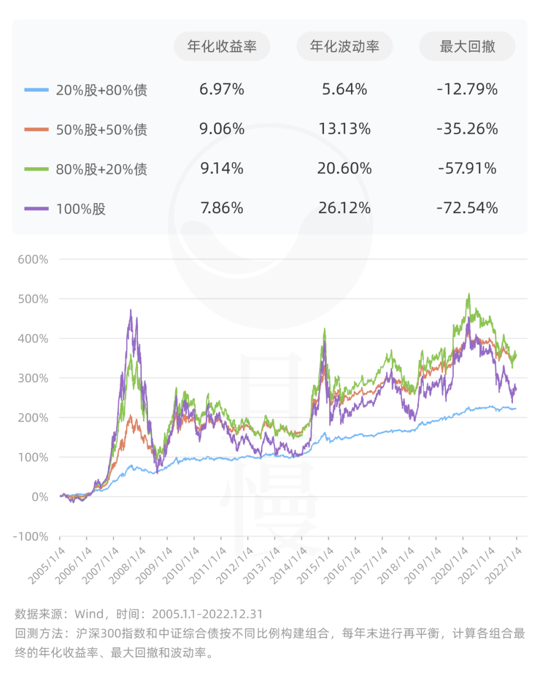 80/20股债组合历史长期收益最高,但年化波动上升到20%以上,历史上最大回撤也高达近58%。