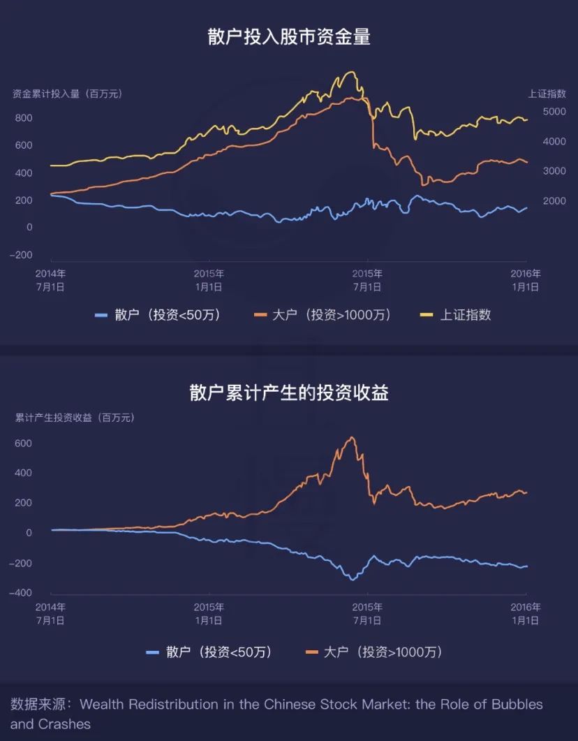 在相对平静的市场中,大户和散户投资收益差距较小,而到了股市快速上涨阶段,大户因为前期的加码和不断的投入收益不断扩大,而散户的收益变化则刚好相反,随着股市上涨反而亏钱。