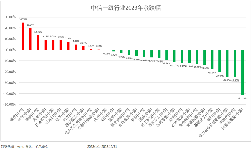 中信一级行业来看,2023年TMT、上游资源所属行业表现靠前。其中通信、传媒、煤炭排名前三。制造、消费赛道所属行业相对靠后。