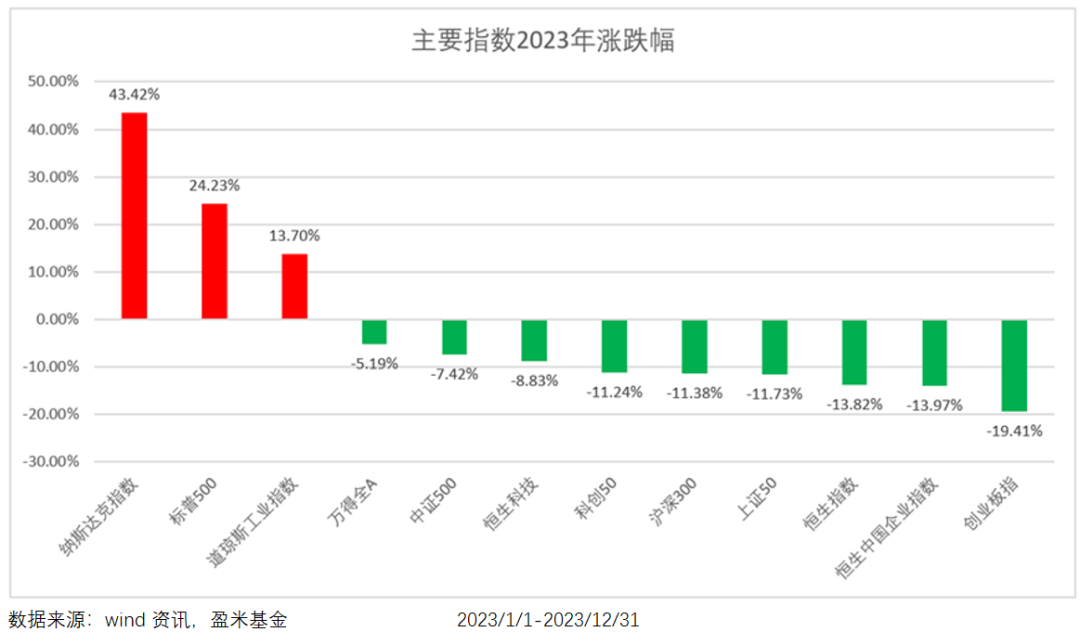 2023年美股主要指数均录得上涨,纳斯达克指数+43.42%,涨幅最多。国内市场主要指数均录得负收益。万得全A指数-5.19%跌幅最少,创业板指-19.41%全年跌幅较多。