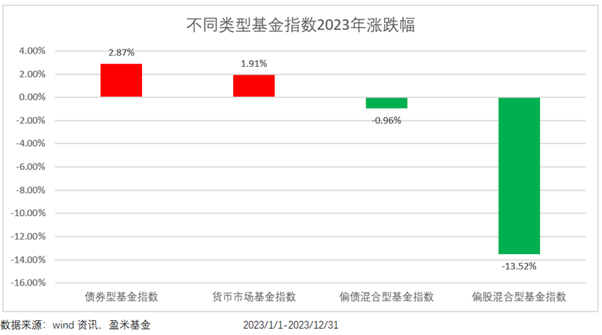 2023年债券型基金指数表现最好,全年+2.87%。货币基金指数次之,全年+1.91%。偏债基金指数-0.96%录得负收益。偏股混合型基金指数-13.52%,全年表现靠后。