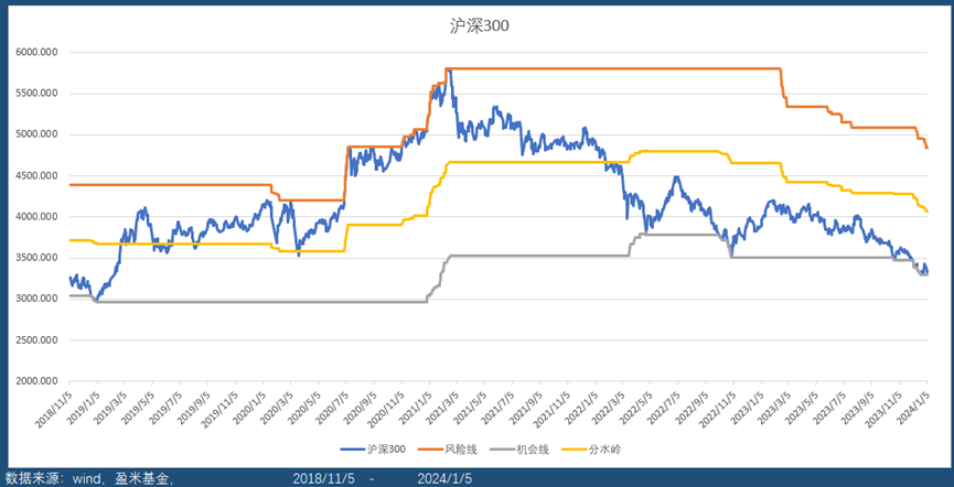 2023年12月制造业PMI为49.0%,环比放缓0.4个点,已经连续三个月下行。可以看出经济整体仍处于弱复苏阶段。不过,制造业在年底放缓有一定的季节性,过去7年来看,大部分年份12月制造业PMI都有环比负增长(数据来源:wind,2023.12.31)。市场整体认为,2024年一季度经济相较于2023年或将有所修复。“躁动”行情有望再现,股票市场可以持续关注。参考过去5年历史,春节前后一般都是央行降准降息的重要窗口。在经济弱复苏的背景下,市场普遍认为春节前后或有降息降准的可能性。在此背景下,债券市场上涨趋势或有望继续延续。不过,考虑到目前10年期国债到期收益率已处于近5年0.8%分位。债券资产考虑标配为主(数据来源:wind,2019.1.3-2024.1.4)。从趋势角度来看,目前股票市场代表性指数沪深300处于机会线附近。参考历史数据,当价格接近机会线附近的时候,未来出现反弹的可能性往往较高。